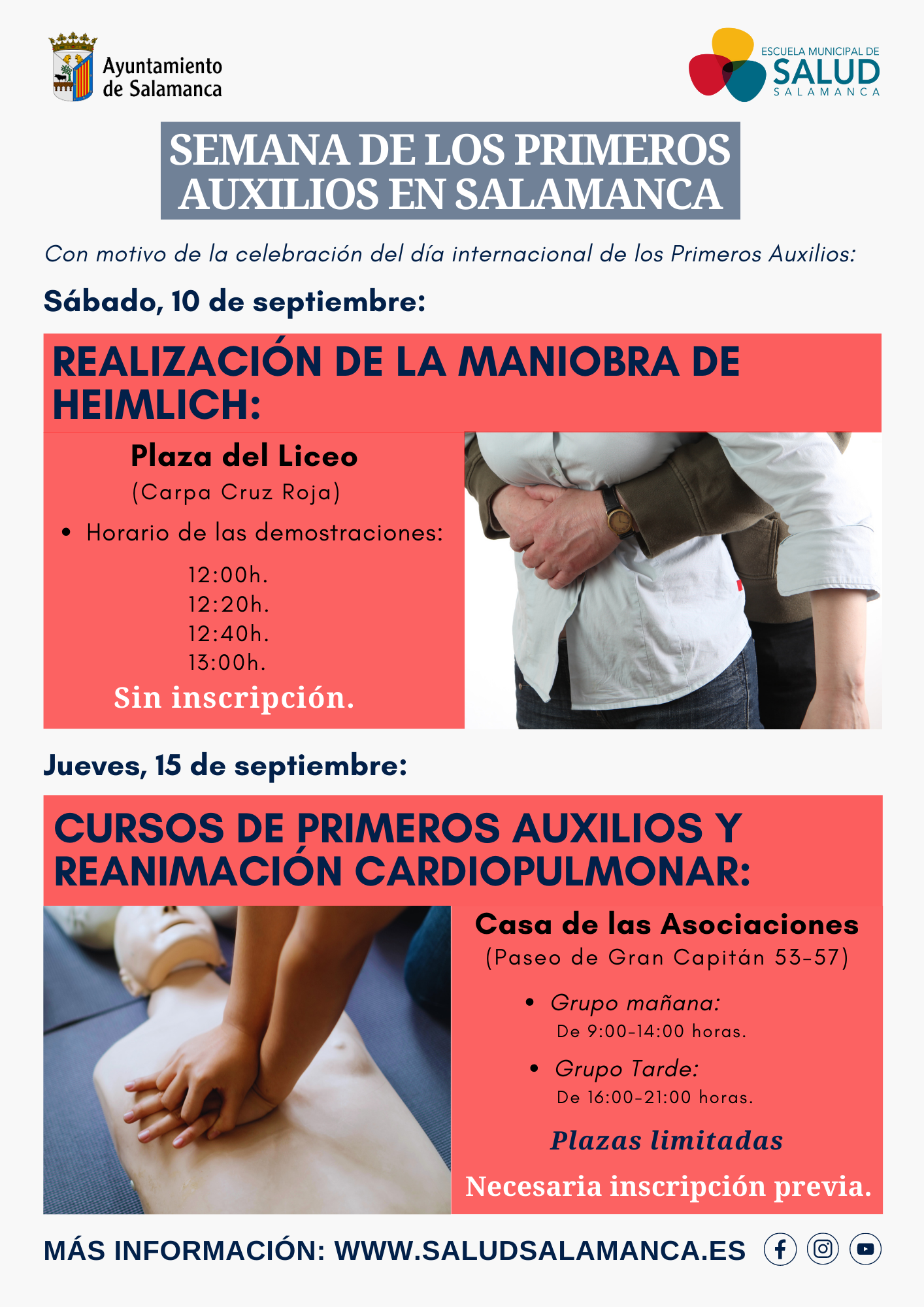 El segundo sábado del mes de septiembre se celebra el día internacional de los Primeros Auxilios. Por ello, la Escuela Municipal de Salud ha establecido a septiembre como el mes de los primeros auxilios para trabajar la importancia de tener unos mínimos conocimientos de actuación ante una situación de emergencia en toda la población salmantina.